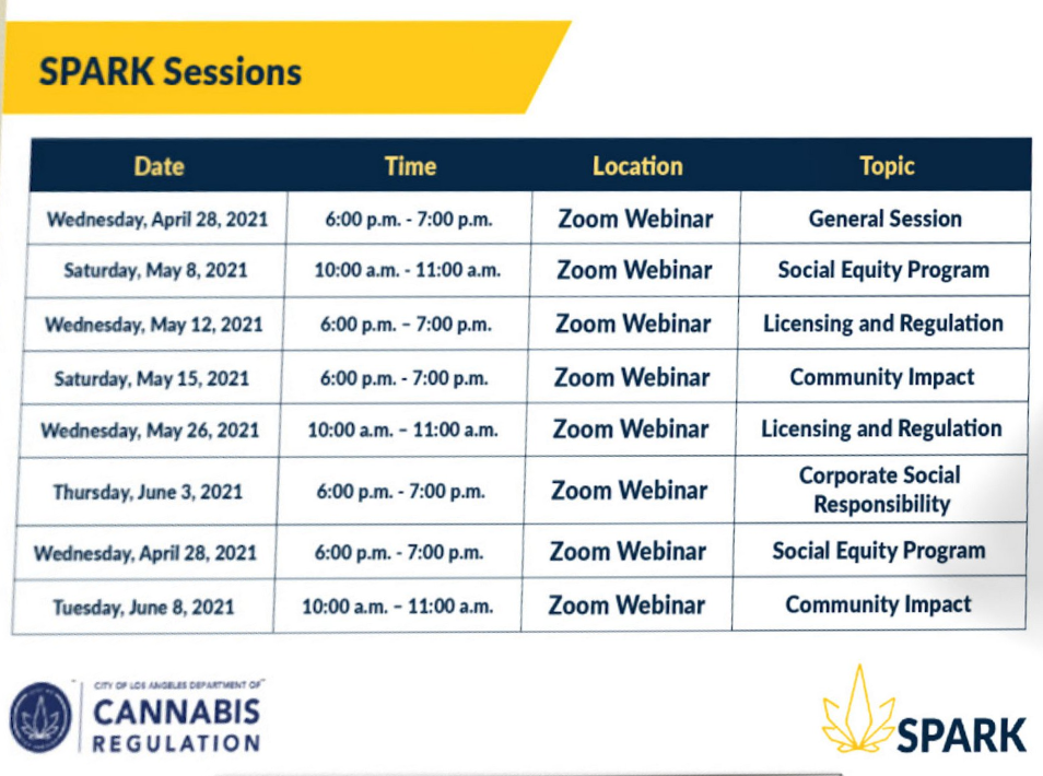 Community participation is vital to responsible and equitable development and implementation of cannabis policy in the City of Los Angeles. Through SPARK, communities can share input that will help inform the Department of Cannabis Regulation as we make future cannabis-related recommendations to the City of Los Angeles Mayor and City Council. We look forward to seeing you SPARK change in our community. Enter the SPARK Virtual Meeting Room from the DCR website.