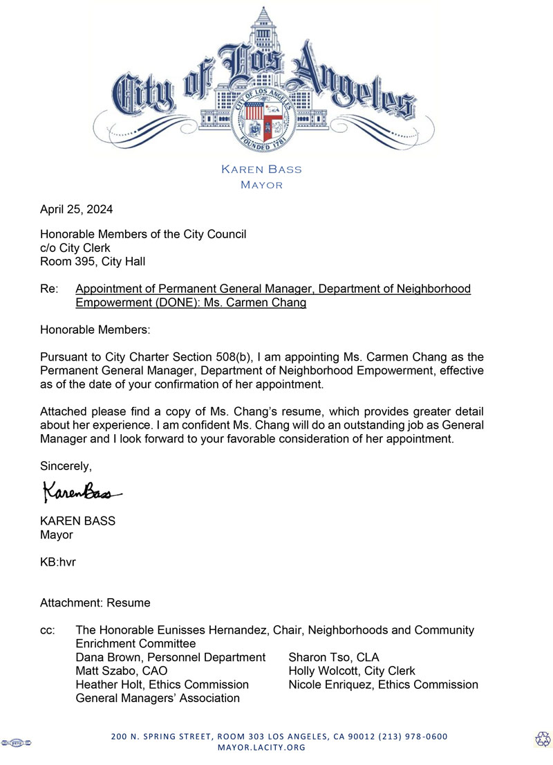 Chang emphasized her commitment to inclusivity and representation in her new role: “I am honored to be appointed to serve as General Manager of the Los Angeles Department of Neighborhood Empowerment. I look forward to carrying out Mayor Bass’ vision for a neighborhood council system that is inclusive and representative of the many cultures and the diversity of Los Angeles”