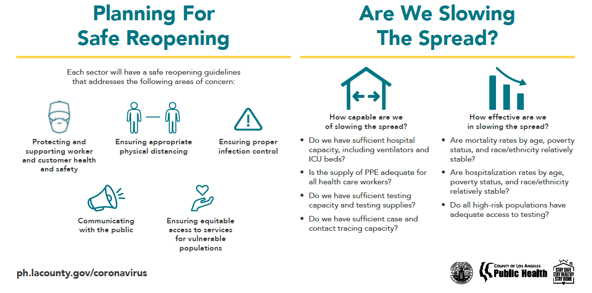 3 LEVEL RISK ANALYSIS – As the City of Los Angeles moves through the stages of recovery, we will be guided by data and science. The County has defined seven key public health indicators that will enable public health and government officials to determine whether the COVID-19 crisis is improving, staying the same, or worsening — and to then take action accordingly. These indicators will evolve as our knowledge of COVID-19 and its effects grows. To track the status of these indicators, phases and steps we’re taking, visit coronavirus.lacity.org/saferla